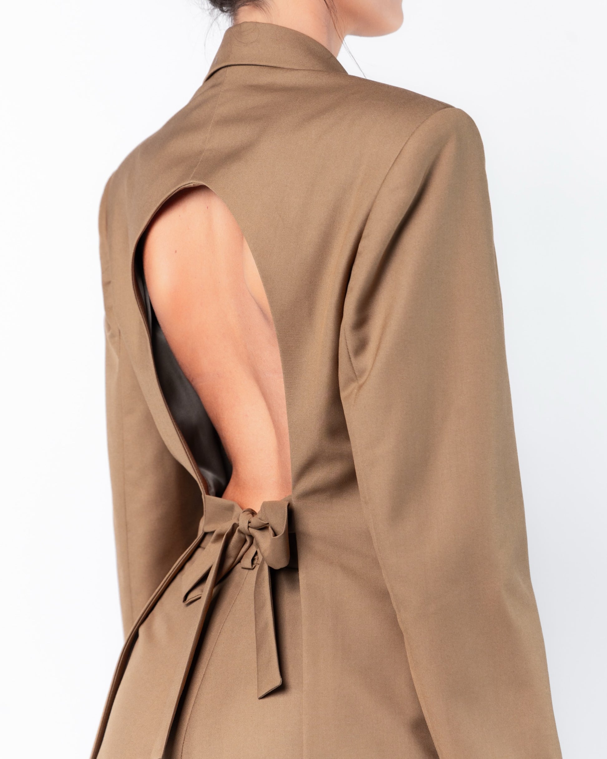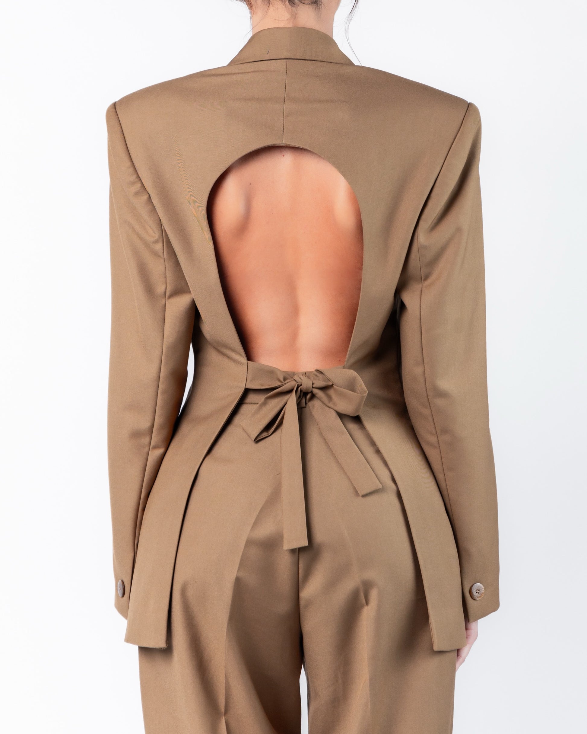 This ensemble showcases a striking open-back blazer made from luxurious fabric, offering a contemporary twist on classic tailoring. The blazer features a fitted silhouette, accentuating the waist and providing a structured appearance in the front. The back, however, reveals a daring design, with a deep cut-out that adds an unexpected element of allure.