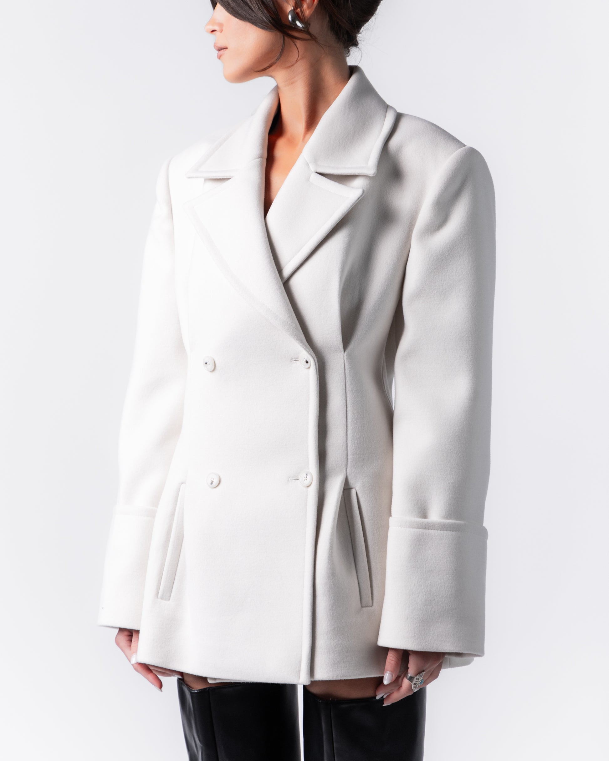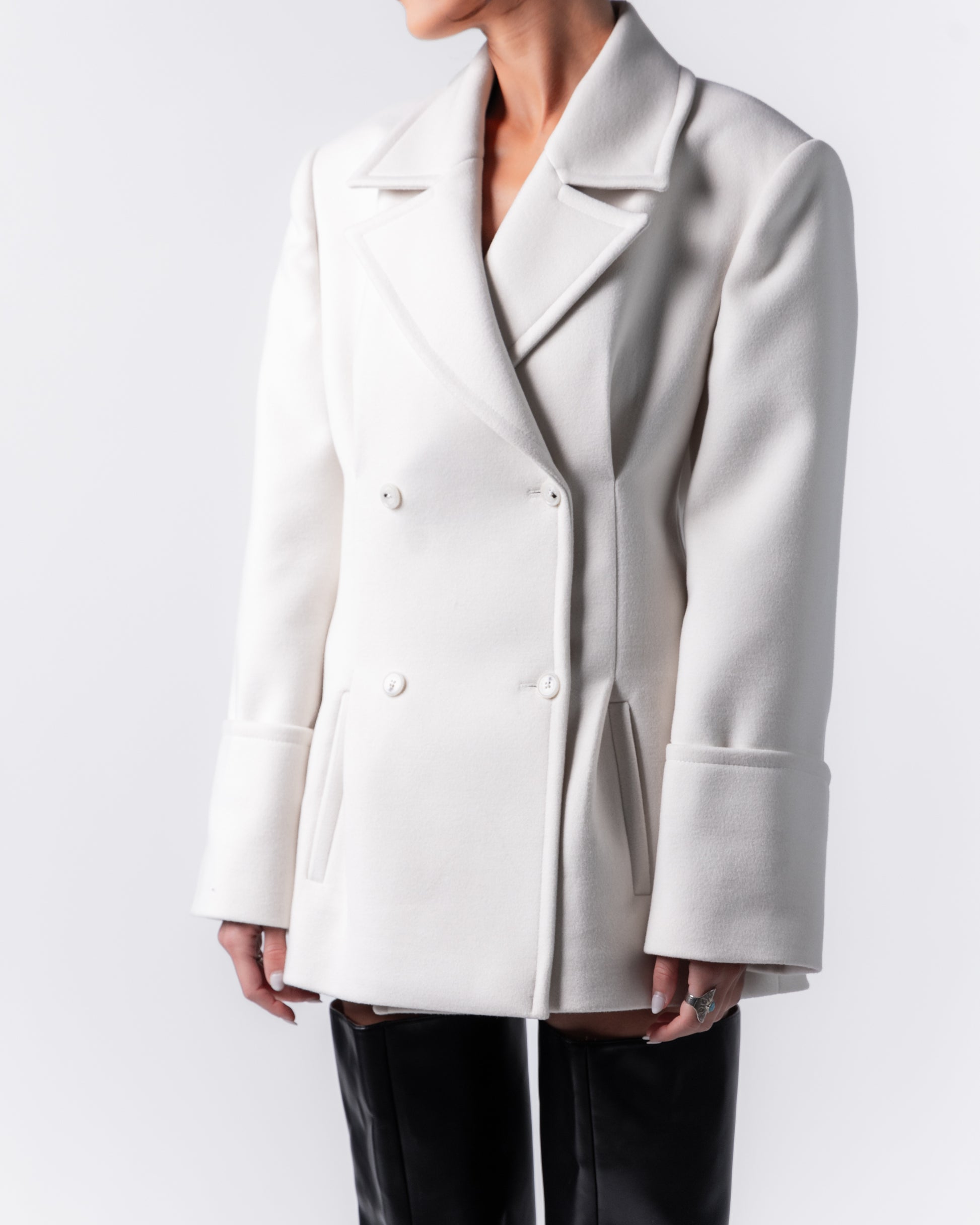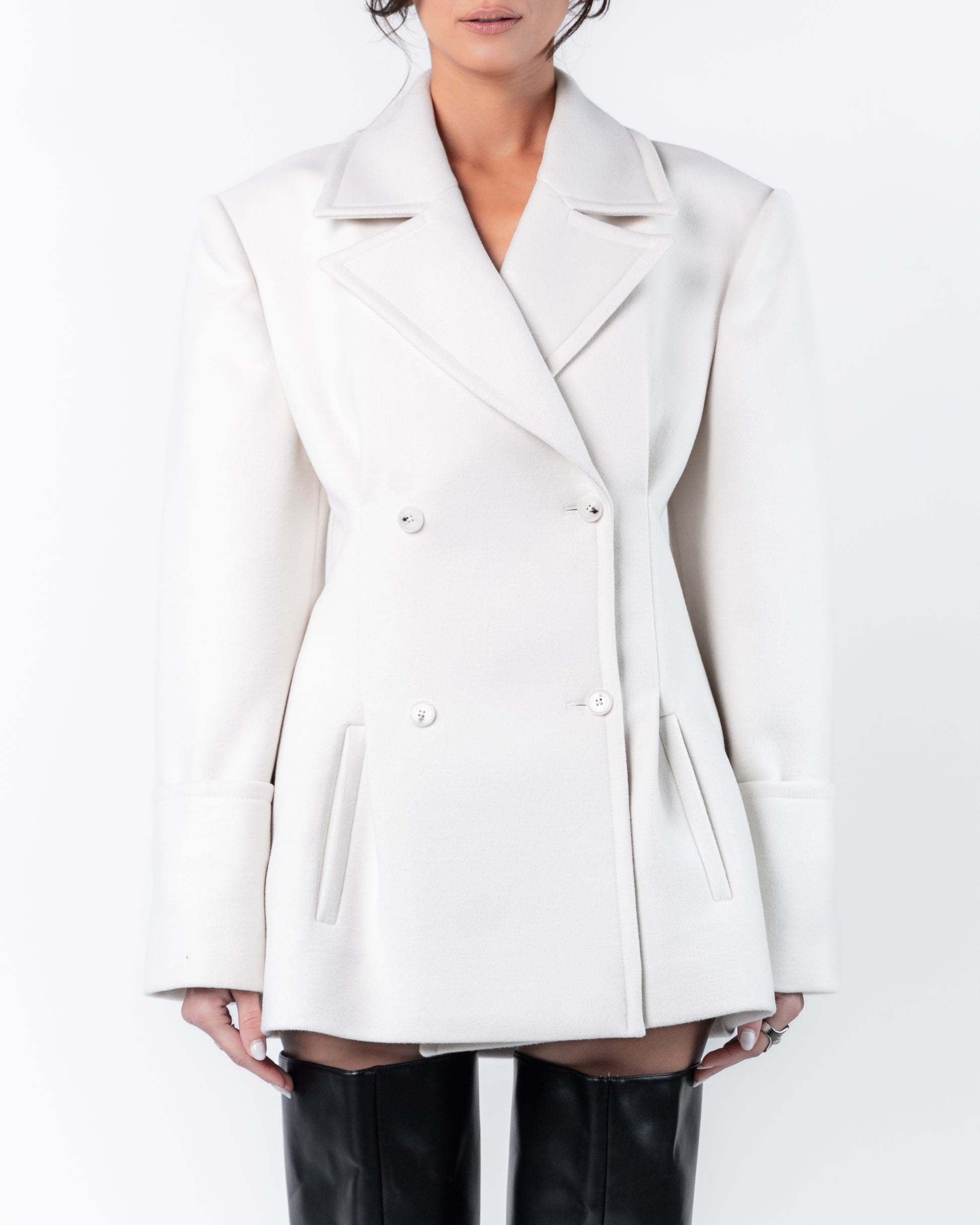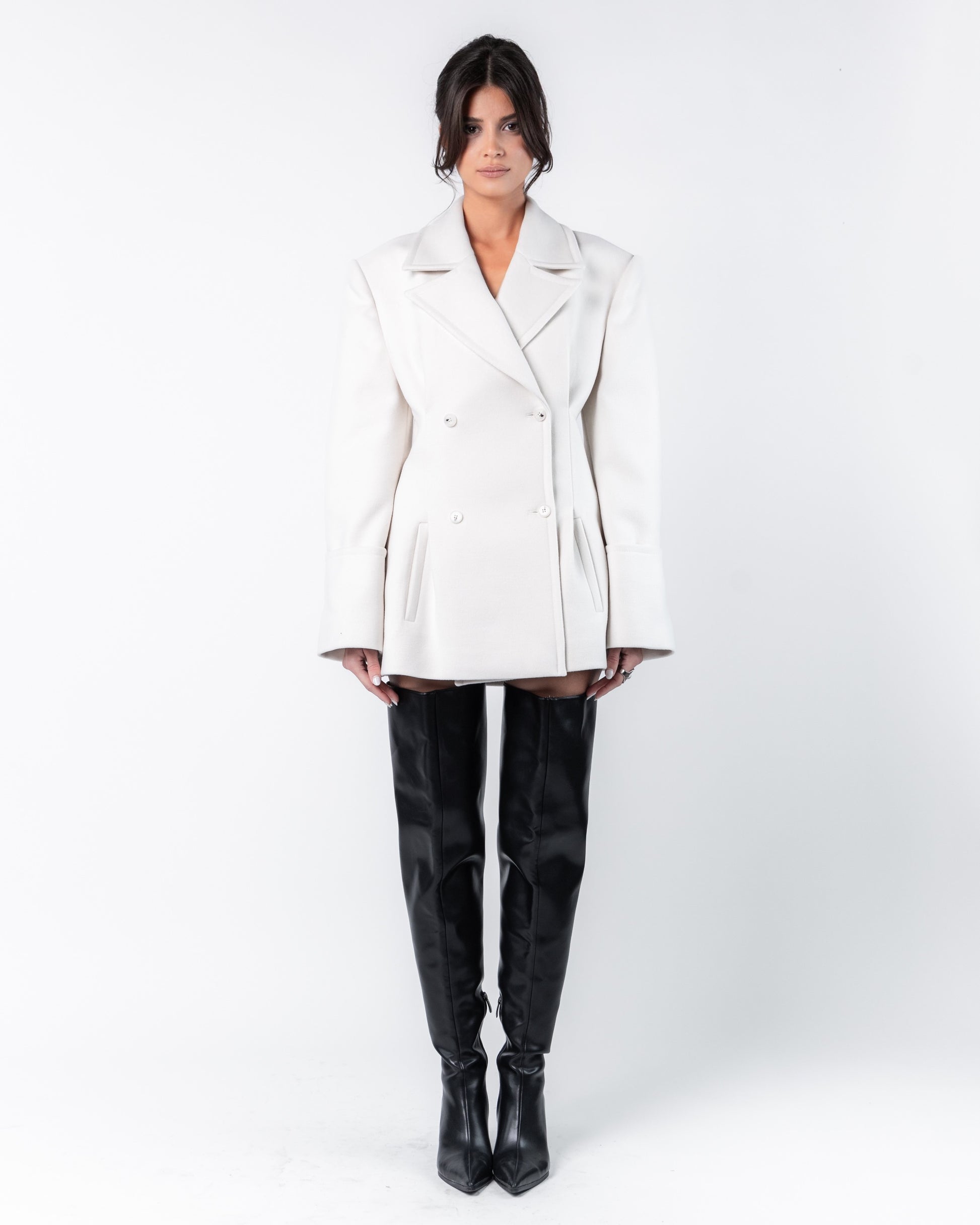 Elevate your outerwear collection with this double-breasted black long coat, crafted from a wool blend for warmth, comfort, and durability. This timeless piece features a structured silhouette with two parallel rows of buttons, exuding a refined, tailored appeal. The coat's peak lapels enhance its formal style, making it suitable for both workwear and evening outings.
