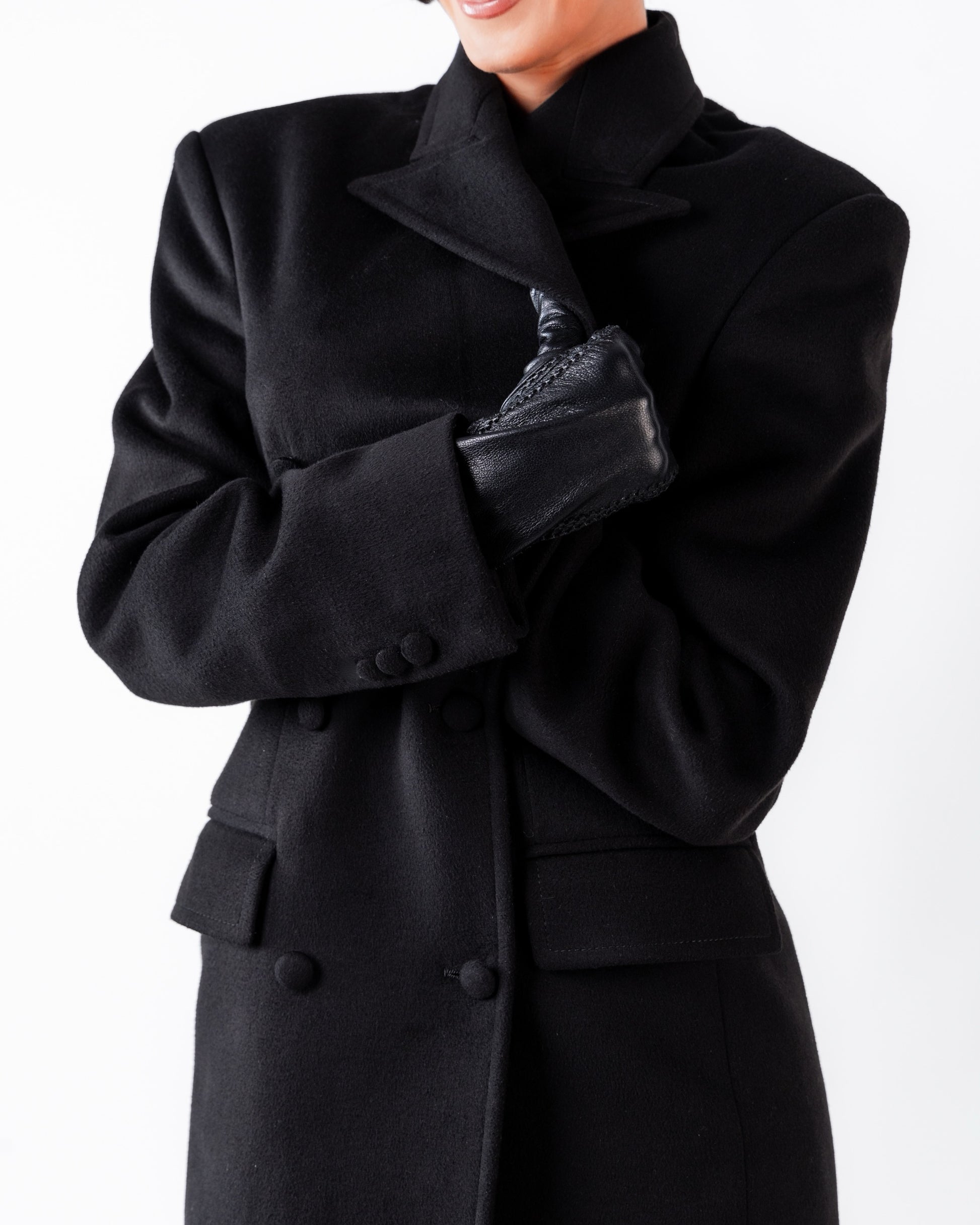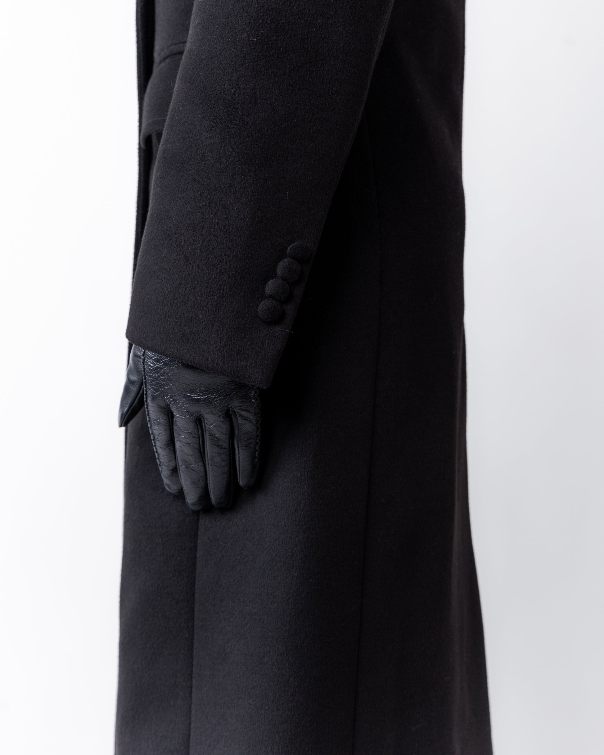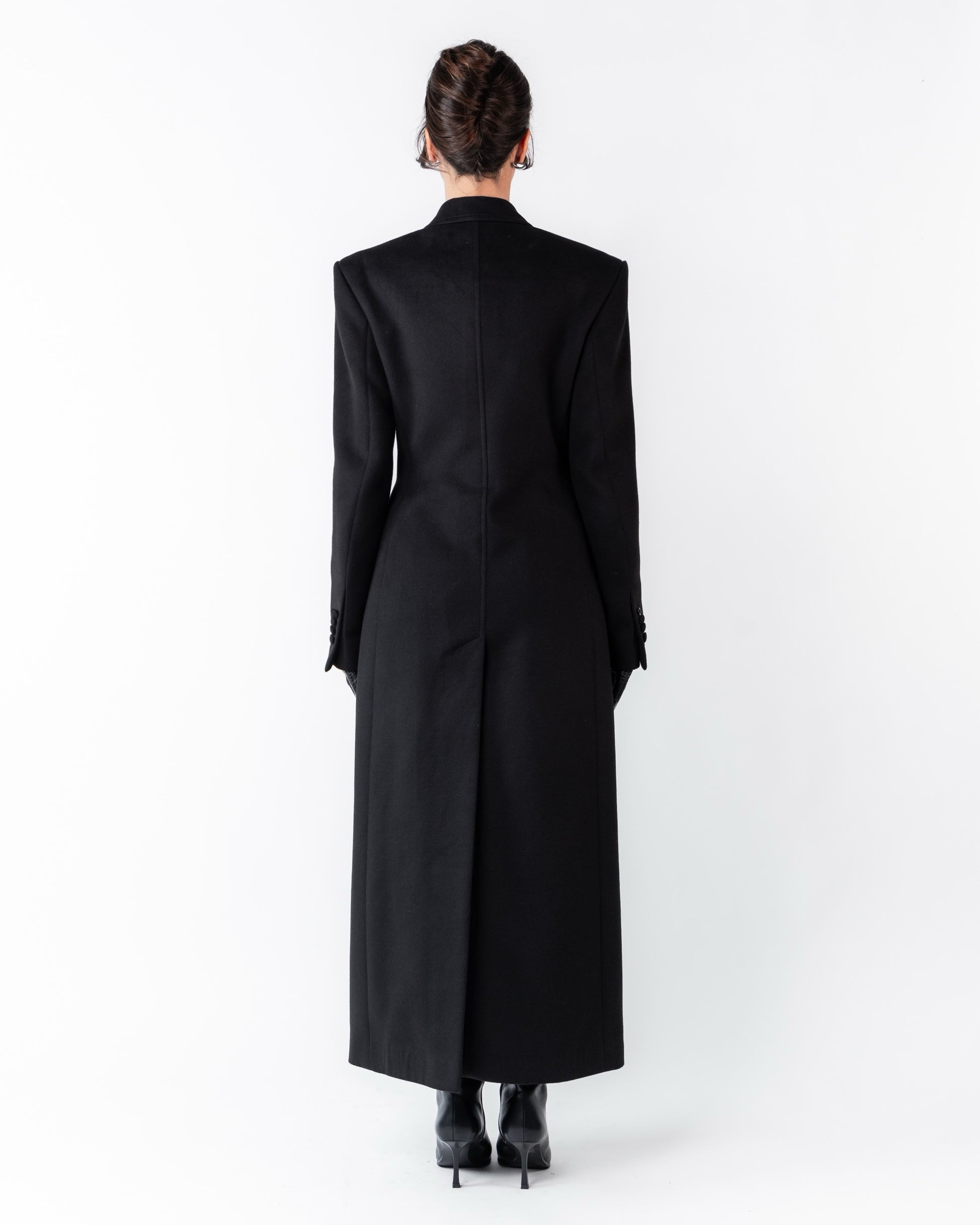 Elevate your outerwear collection with this double-breasted black long coat, crafted from a wool blend for warmth, comfort, and durability. This timeless piece features a structured silhouette with two parallel rows of buttons, exuding a refined, tailored appeal. The coat's peak lapels enhance its formal style, making it suitable for both workwear and evening outings.