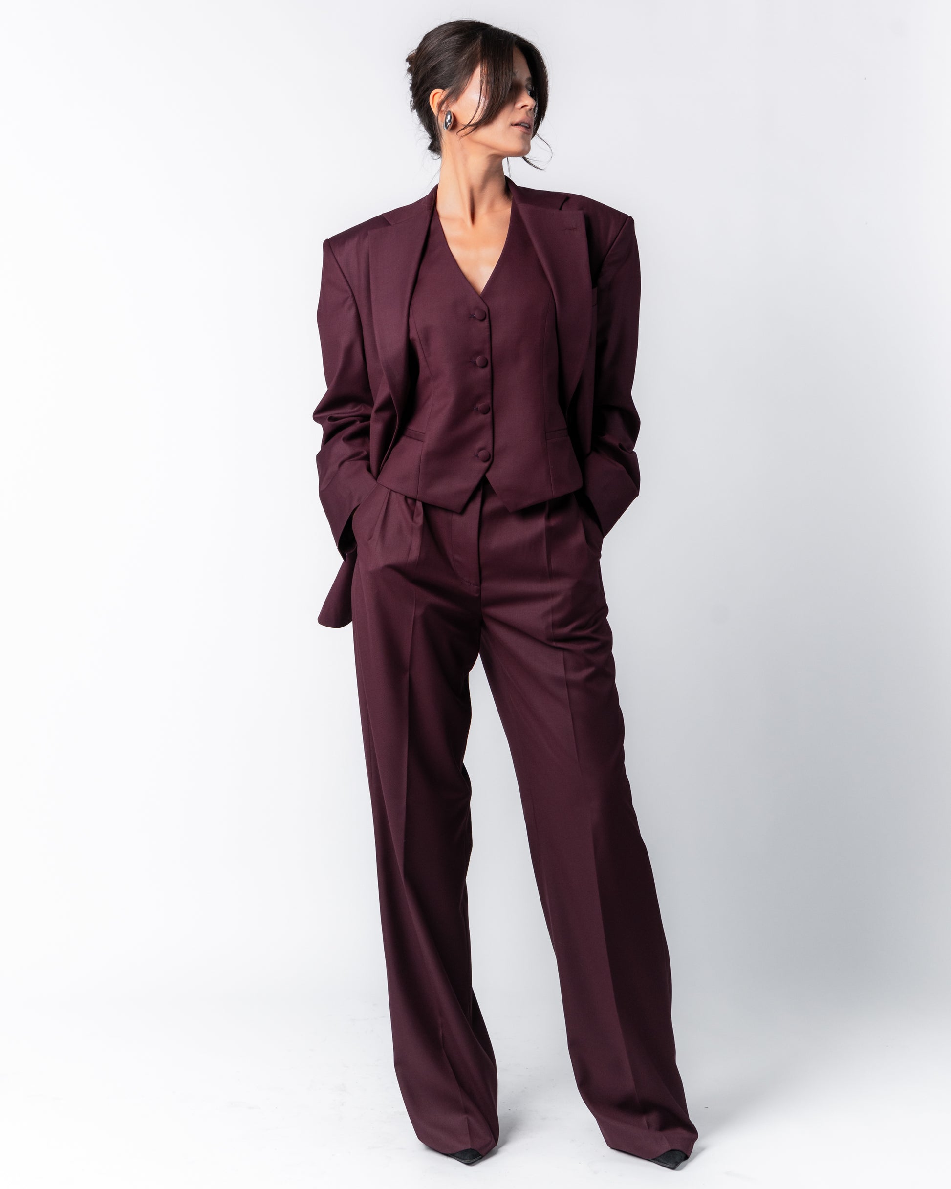 The burgundy three-piece suit exudes elegance and confidence, making it suitable for both formal occasions and stylish day-to-day wear. Its unique color sets it apart from more traditional suits, allowing the wearer to make a bold statement while still looking polished and professional.