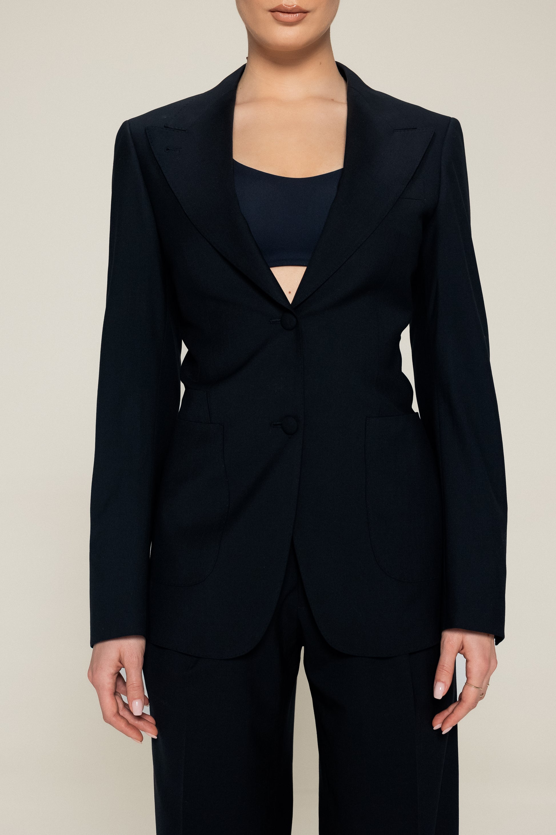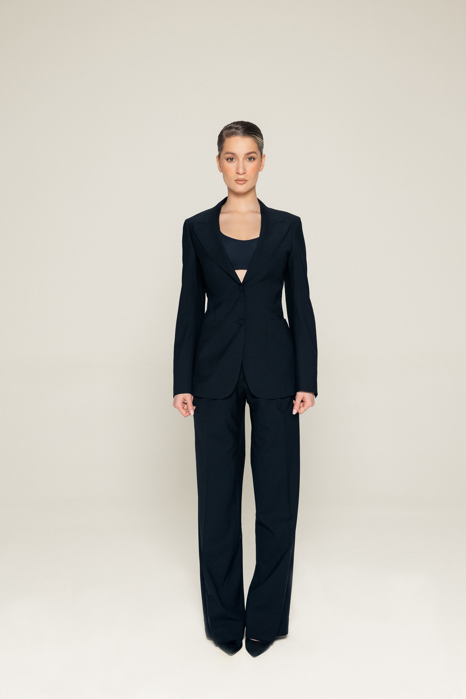 Classic cut pants and jacket with two flap pockets and one inserted in the chest.