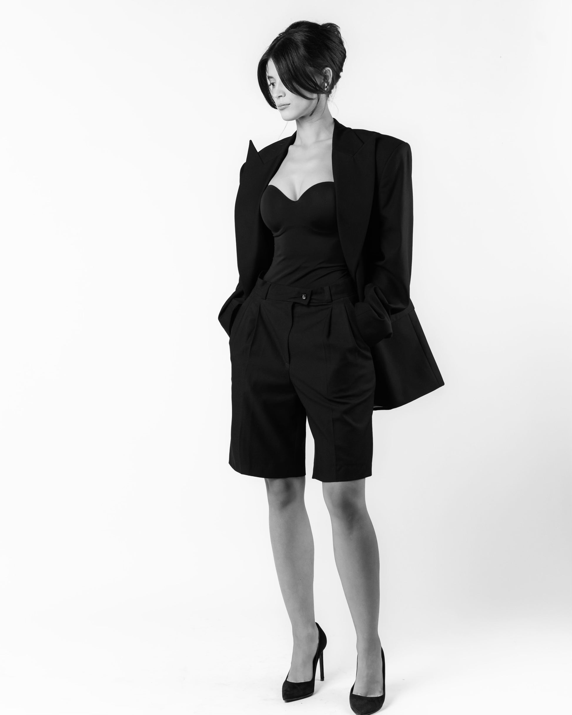Paired with the blazer are tailored Bermuda shorts that hit just above the knee, made from a coordinating fabric.